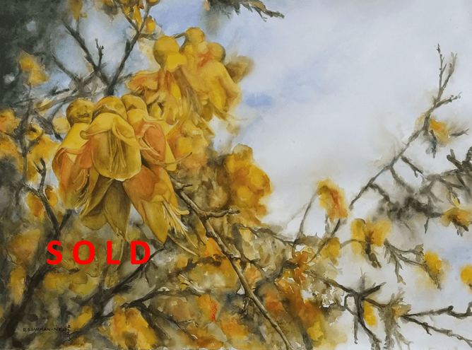 Rebecca Dowman-Ngapo's watercolours have been gallery favourites across all exhibitions that feature this medium. The Winter Collection 2023 is no exception. Foreshadowing warmer times ahead, Herald of Spring presents bursts of kowhai yellow blossoms that grasp the attention of the viewer, And byers. This one now firmly in the latter column.,