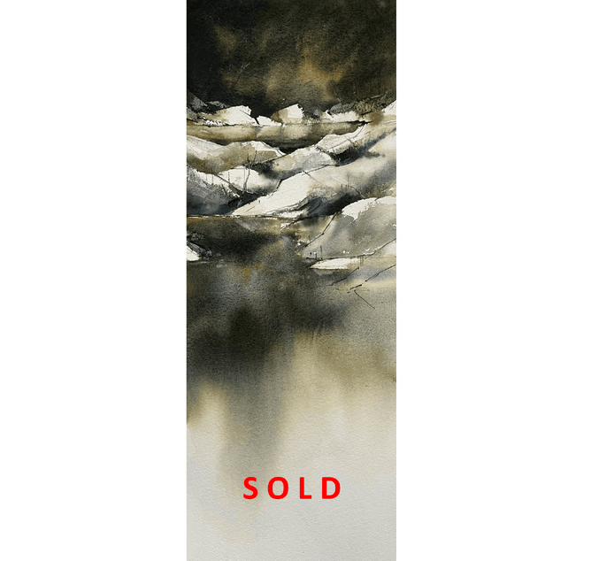 Unsurprisingly, Bernadette Parsons watercolour compositions often bring comparisons with JMW Turner. Night Rock Pools, sold from the Winter Collection 2024 has drawn such comments of late. Bought by a watercolour artists who marvelled at the strength and delicacy of this painting.