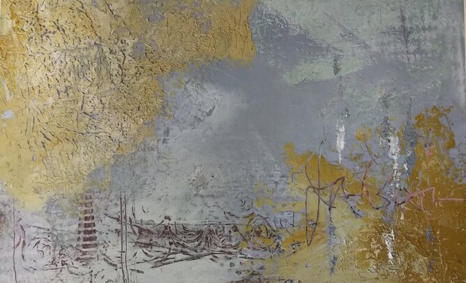 Gallery artist Maggie B. Sullivan continues to present intriguing, atmospheric compositions that are anchored in astronomic reference points. Her Postcards from Pleiades series offers immersive viewing; in this case inviting, Expectations of Hope.