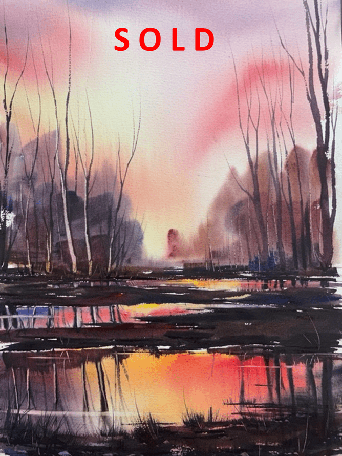 The composition, Last Light in a Kanuka Swamp is rich yet mellow example of Martin Necas’s work. It combines a tranquil setting with a colour palate that stresses the interplay of sunset on both water and sky. The illustration radiates warmth at end of day.