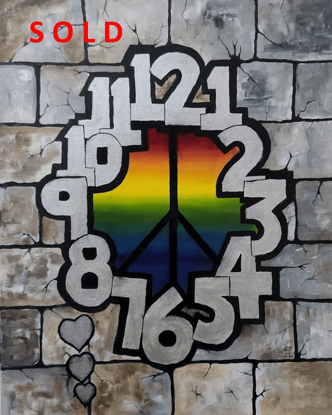 Sandra Barlow's contemporary composition, A Peaceful Time, takes the exhibition title Our Times, quite literally by inserting a time-piece into a solid wall that opens a window looking towards the colours of the spectrum enhanced by the powerful peace sign. In these times, 'our times', Barlow's oil painting lays down both a hope and a challenge. A series of three love hearts reflect this challenge in term love's influence that can be seen as rising or falling.