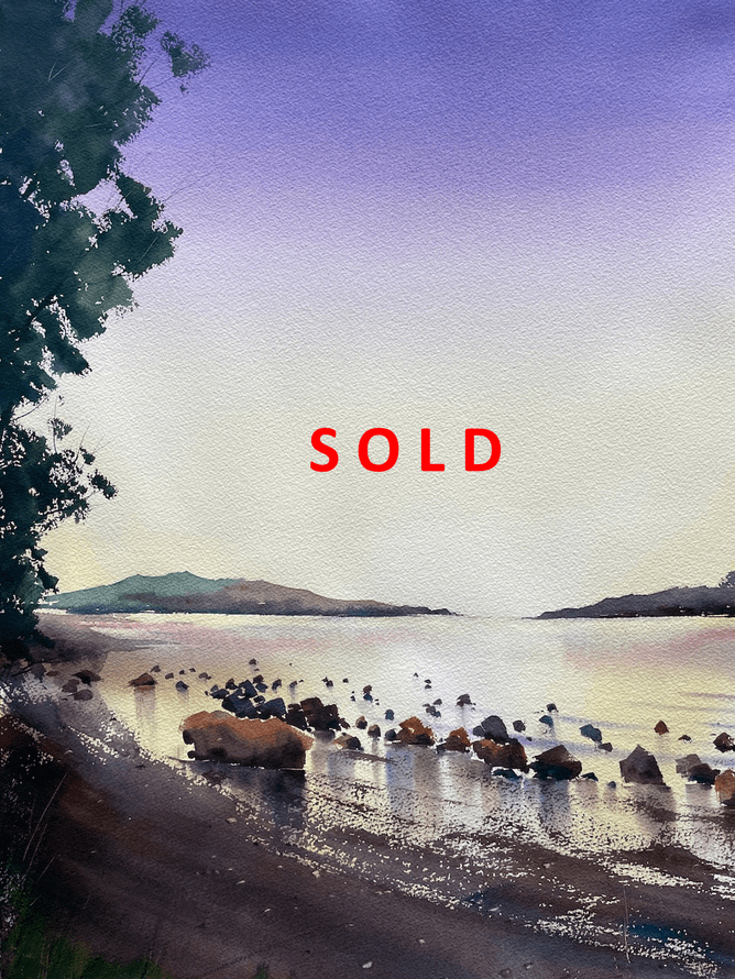 From the Waikato Watercolourists III exhibition, the Martin Necas stunning composition, depicting Raglan Shore has found favour with buyers who have recently moved to the Waikato from Wellington.