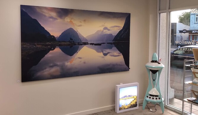 Of Herculean dimensions, this mighty, at 1.4 x 2.5m digital art photography, Mitre Peak, Milford Sound, by Stephen Milner from his Timeless exhibition, demands the viewer's attention. The composition uses an innovative fabric tension system that enables large display that better captures the majesty of the subject. Situated in the exhibition adjacent to the main gallery window this spectacular photograph is literally a street-stopper (see image below). Now destined to adorn a large wall of a Waikato-based collector.