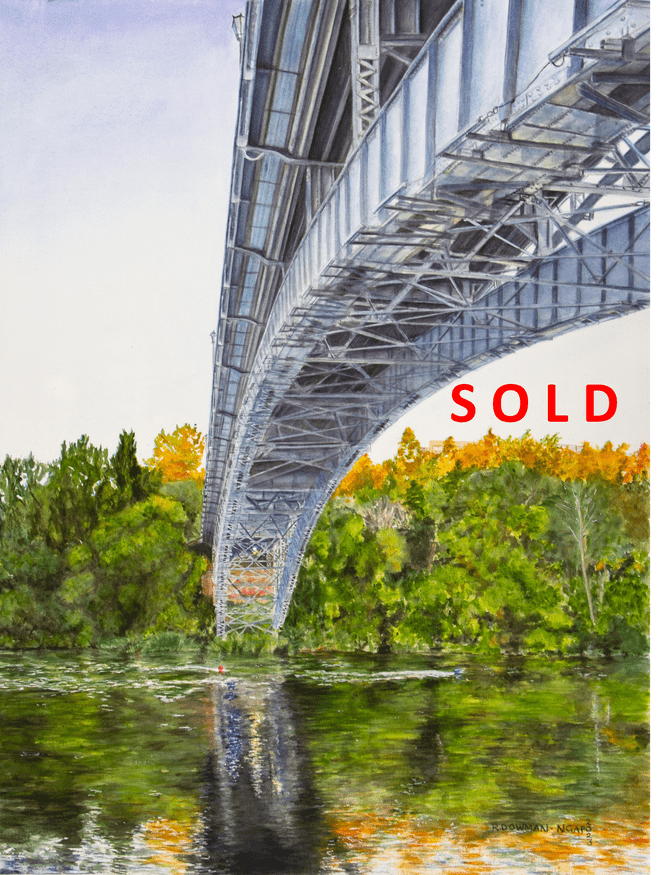 Using a novel vantage point for her composition Victoria’s Curve, Rebecca Dowman-Ngapo has captured in detail the intricate nature of this bridge structure while presenting its inherent strength. It is a marvellous view of a vital arterial bridge spanning the mighty Waikato River, providing a confident curve that enables city life to go about its business. This is Rebecca’s third sale from the Waikato Watercolourists III exhibition.