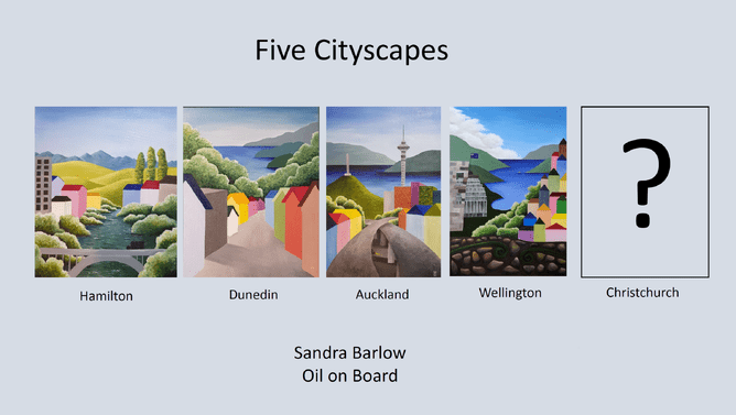 Whereas many New Zealand artists rightly turn their brushes towards capturing the majestic scenery of iconic New Zealand landscapes, gallery artist and Trust Board member, Sandra Barlow has embarked on a unique quest to present a series of paintings of five major New Zealand cities. Recently the fourth city in the series, Wellington was sold on its first day of showing. All four are now in private collections.