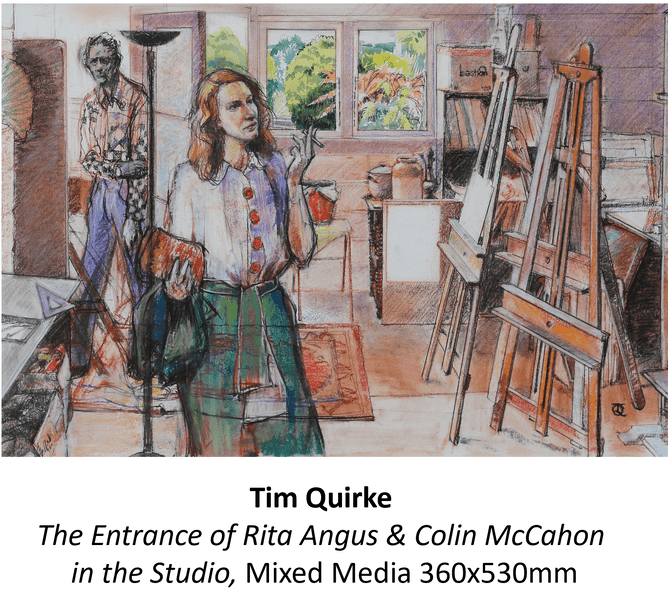 Tim Quirke studied the work of Rita Angus and Colin McCahon closely enough for them to have a formative impact on his own artistry. This depicted by showing their presence in his Rotorua studio. Presented in the Welcome Swallow Gallery exhibition, Drawn From Life in collaboration with Fine Art Society New Zealand, this important work sold quickly on preview day prior to the exhibition opening.