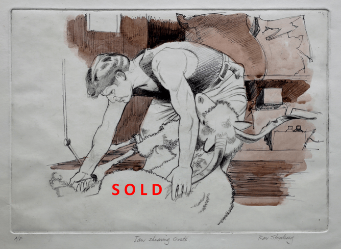 Ron Stenberg (1919-2017) had a long distinguished career as an artist, teacher and illustrator, carrying our his practice in New Zealand and Scotland where he spent his last 30 years as a Professor of Painting at the Duncan of Jordanstone College of Art in Dundee. Destined for the south island, this 2011 composition, from the Fine Art Society New Zealand exhibition, Drawn From Life, Ian Shearing Goats, is a hand-coloured etching. It sits alongside a similar pastel subject composition from 1991. These are the only two same-subject pieces known to exist in the Stenberg collection.