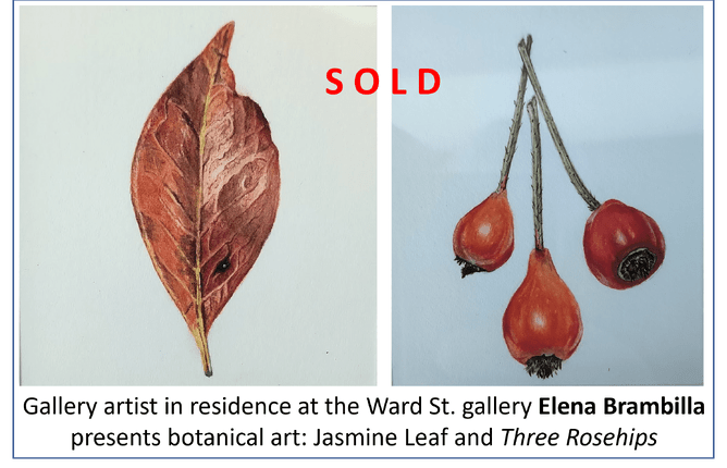 Elena Brambilla has attracted much interest in her residency at the Ward St. gallery, While working on new compositions has sold these two beautiful botanical watercolours, Jasmine Leaf and Three Rosehips.