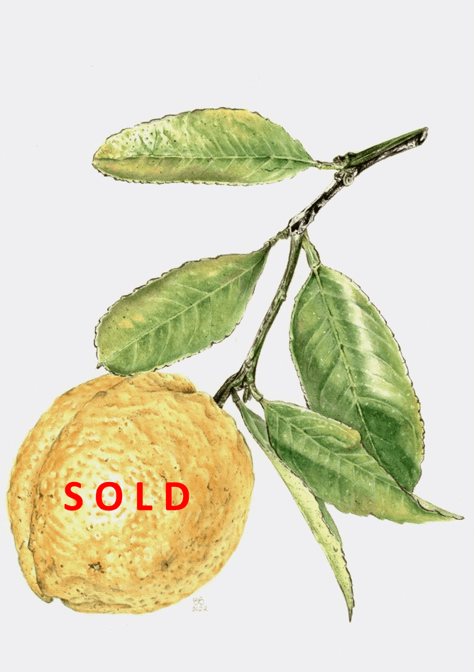 Sold from this year's Waikato Watercolourists III exhibition, Lemonade Fruit, by Italian gallery artist, Elena Brambilla. As a watercolour botanical artist Brambilla is able to demonstrate discrete, intense mastery of her subject. This fruit has surely been picked!