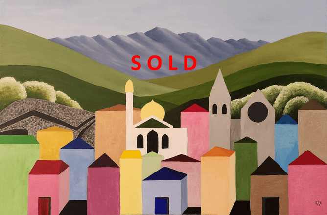 The stylized buildings that dominate the painting represent the strength of the people of Christchurch standing together, while the Al Noor Mosque and Christchurch Anglican Cathedral can be seen adjacent to one another. To the left is the new Te Pae Convention Centre that appears to represent an earthquake damaged building, but I highlighted the design because it shows the braided Canterbury Rakaia River together with the many conversations that this design has encouraged.