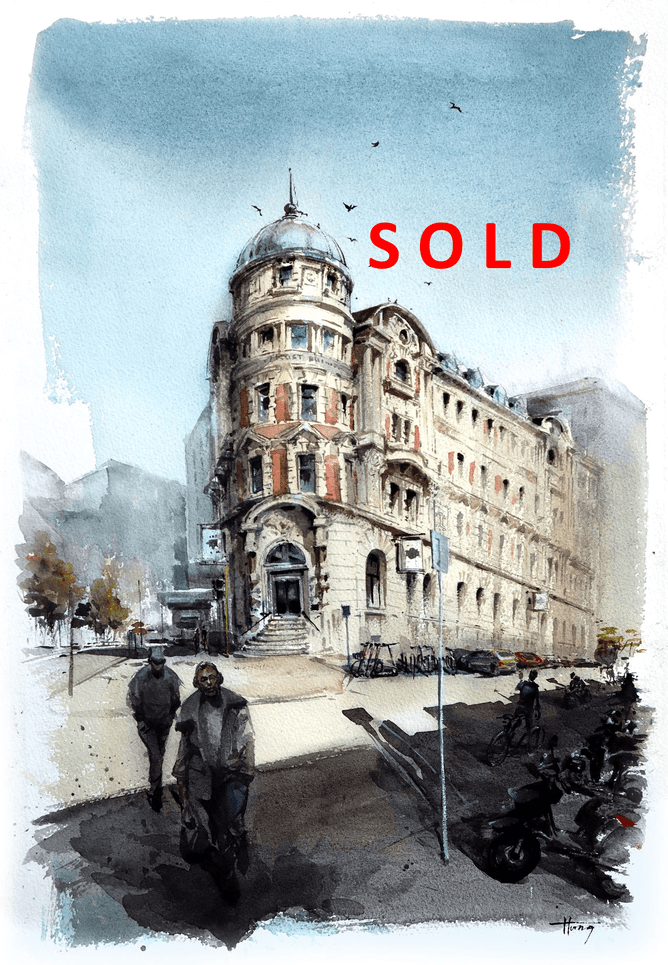 Sold from the Structure & Place exhibition, the remarkable edifice of the Public Trust building, Wellington by gallery artist Hong Cumming. This beautifully structured intimately technical composition was uplifted by a Wellington firm, but will stay in the gallery for the duration of the exhibition thus enabling the public enjoy this painting.