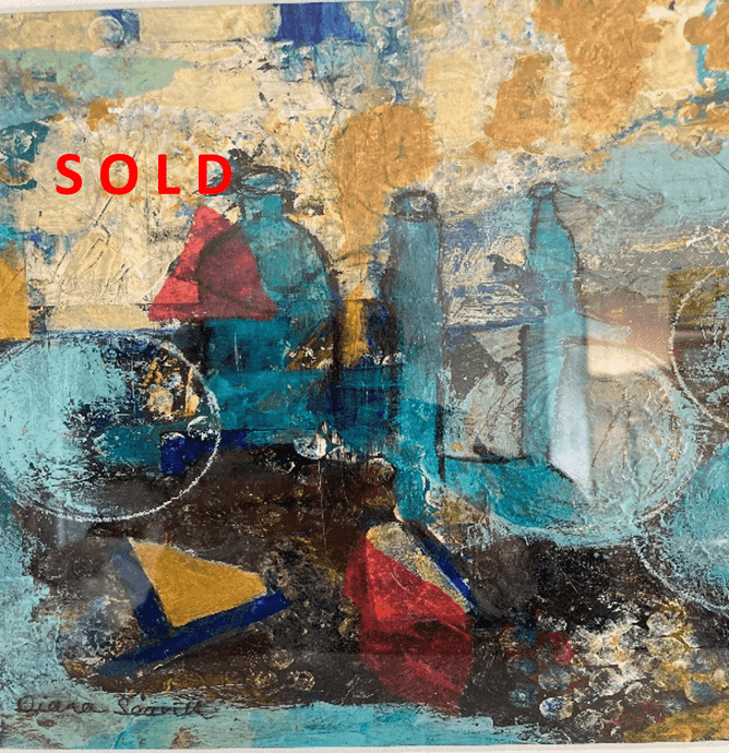 On opening night of the Yours, Abstractly Showcase, gallery artist Diana Seavill presents Baubles with Bottles, an expressionist abstract composition that quickly found favour with a local collector.