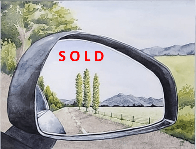 Selling on the first day of The Five Studies exhibition, Sandra Turner-Barlow’s, mind-bending dual mirror image presents a parallax view that uses wing mirrors (R) to bring a partial view of the past into sight.