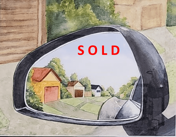 Selling on the first day of The Five Studies exhibition, Sandra Turner-Barlow’s, mind-bending dual mirror image presents a parallax view that uses wing mirrors (L) to bring a partial view of the past into sight.