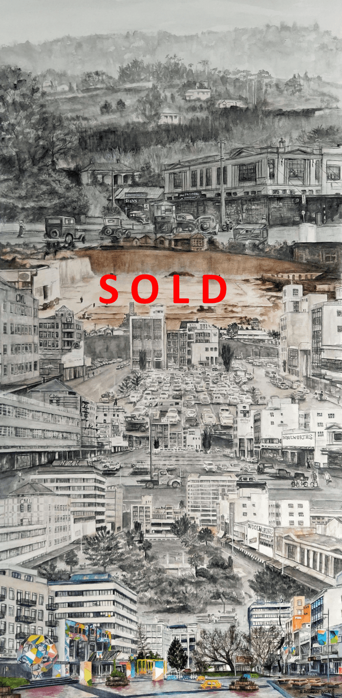 Rebecca Dowman-Ngapo's stunning composition, From Garden to Place that sold on the opening night of the exhibition, The Five Studies, features no less than 8 historical paintings of Garden Place in Hamilton, in vertical scroll like dimensions. A veritable artful taxonomy like none seen before. Breathtaking details that pace local social history.