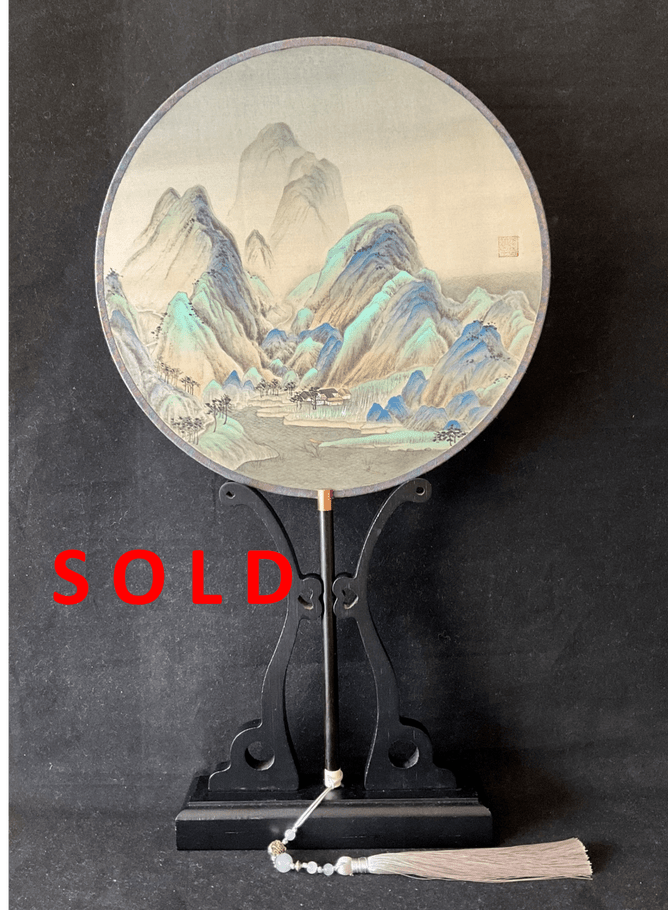 This fan represents a section of a famous painting; a masterpiece of China’s “blue green landscape”. The entire original painting (see below) is nearly 12 metres long. It was created by an 18-year-old prodigy during Northern Song dynasty whose name is Wang Ximeng. It is imbued with a tremendous momentum that can ‘conquer mountains and rivers’. This is typically seen as the national image that documents and represents the Song dynasty. Accordingly, it can be called the Aerial China of the Song dynasty. Wang Ximeng died at a very young age of 20. The painting is the only work by the artist. He used minerals as the main pigments, presented a collection of mountain formations and rippling waters from both the North and the South and in this way portrayed the vast magnificent landscape of the country. The painting is seen as a masterpiece of “blue green landscape”. The fan is a tribute to this important part of Chinese history.