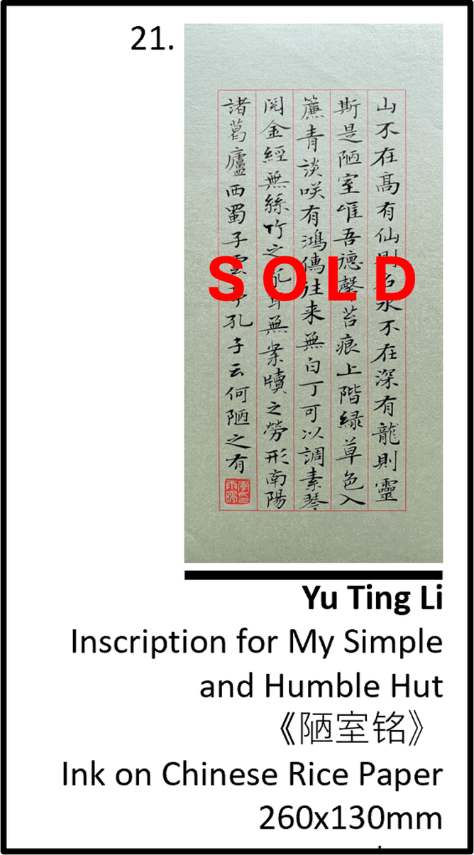 This beautiful illustration of Chinese calligraphy from gallery artist Yu Ting Li, entitled Inscription for My Simple Hut is an exquisite composition that highlights the delicacy and precision of calligraphic iconography. Set out below is a translation of the inscription.