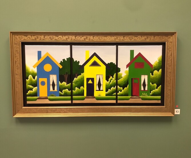 Following on from her Five Cityscapes showcase, Turner-Barlow has further developed her expressionist methodologies with a unique composition entitled, New Zealand Street. This hypnotic triptych. in the latest exhibition, Street Stories, emphasises simultaneously, both similarities and differences in what we recognise as dwellings familiar to New Zealand. Different shades in vegetation as well design imperatives are punctuated by a single door that is slightly ajar, indicating and inviting further dialogue around the street narrative presented. The gallery is proud to represent this iconic painting.