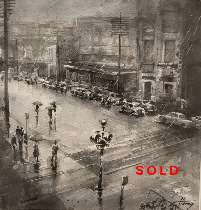 Hong Cumming matches her watercolour artistry with her interest in capturing Hamilton social history. The scene here is of Victoria Street that until 1964 saw steam trains crossing the town's main thoroughfare. It's Safe to Cross Now, from the exhibition, Street Stories shows traffic clearing, following the passing of a steam train. A slice of history with many stories told.