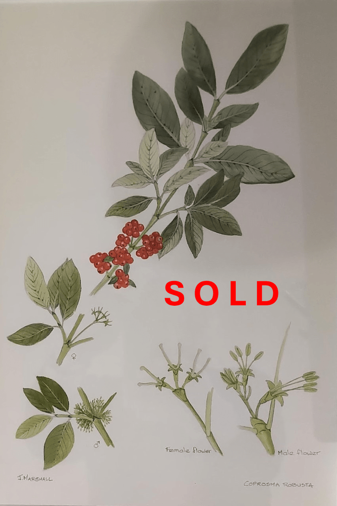As the artist for several New Zealand stamps, Janet Marshall's botanical compositions have graced the gallery to much admiration. On this occasion, her Coprosma Robusta watercolour is off to be planted in a new artistic garden.