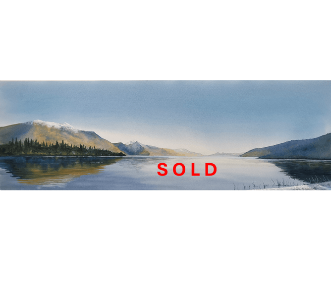 Morning Frost at Queenstown is a superb painting by Chris Greenslade, gallery artist and winner of New Zealand’s watercolour painting of the year in 2023. Greenslade uses a masterful watercolour technique that combines intricate detail with a panoramic landscape grand narrative.