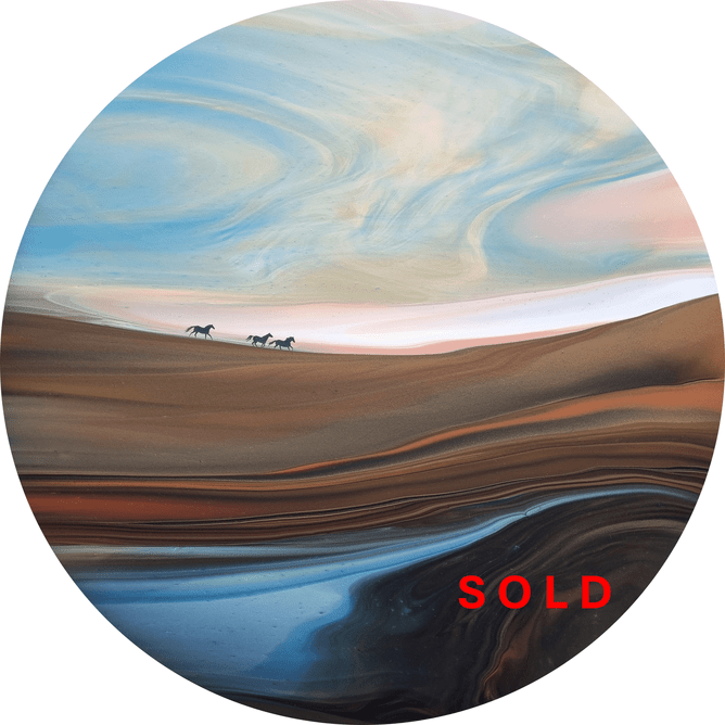 Toni Kingstone's magical realism compositions typically invoke narratives that are both insightful and challenging. In the case of Wild Horses, now sold, one cannot help but recognize the prospects of leading, following - or lagging far behind. Poignant social commentary indeed.
