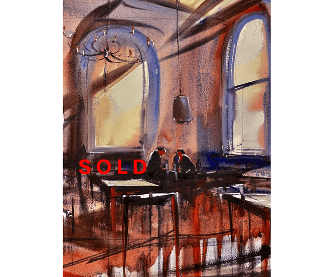 With his florid watercolours, Martin Necas has the ability to capture a moment in time. At the End of a Hard Day, is just such a composition. A tired bar that has seen many 'end of days' is presented with a strong European ambience, and timeless rituals that bond that create meaning for the viewer. The painting presents a beautiful balance of dark and light.