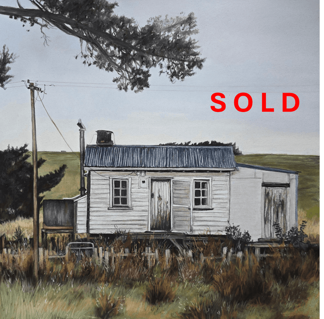 Sold on the opening night of the Pepper exhibition, Bernadette Ballantyne’s composition, Forgotten, in her signature soft pastel. A classic evocative rural piece of New Zealand real estate supremely depicted.