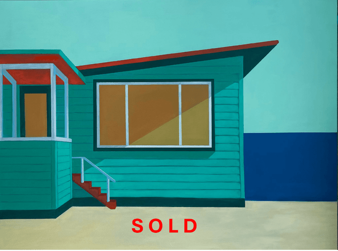 Sold from the Our Place exhibition, Juliet Roper's, acrylic on canvas composition Joan and Bob's Place. This Hockney pastiche-inspired painting has attracted great attention from the gallery audience, presenting memories of New Zealand bach life.