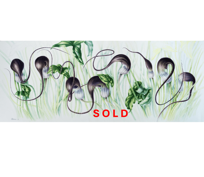 Sue Wickison's Outrageous Plants exhibition has received enormous publicity since the launch in January. National radio and press coverage has led to a steady flow of admirers to the gallery; with a healthy phalanx of buyers too. Sold most recently, is the Mouse Plant with a rather more fancy Latin name of, Arisarum proboscideum. It is a magnificent watercolour composition that flows effortlessly across its embossed frame.