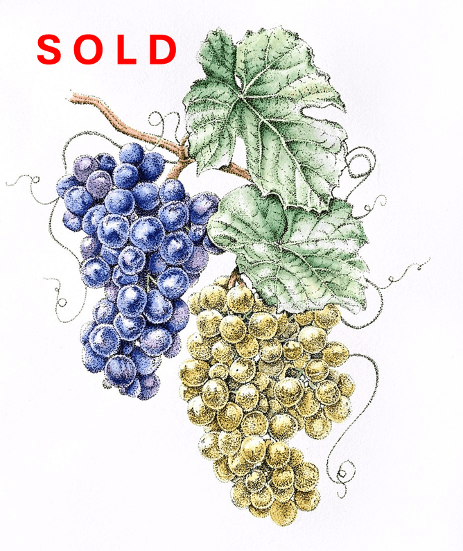 For the Out of Italy exhibition, gallery artists Elena Brambilla called on her skills as a botanical artists to capture the 'fruits of Italy', in this case, the beautiful ink and watercolour composition, Franciacorta: Uva, sold for consumption on opening night.