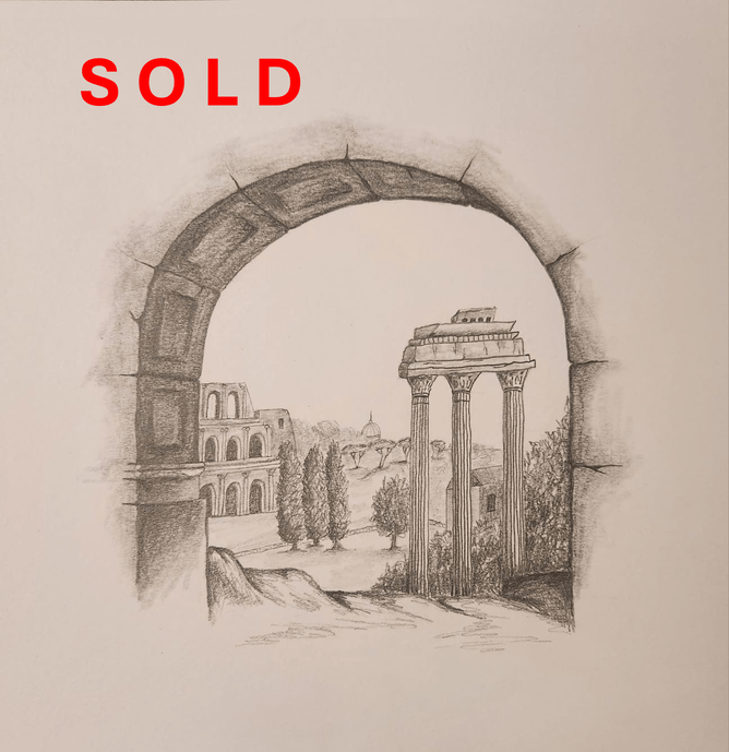 Using her own en plein observations, Turner-Barlow takes advantage of the expressionist method to provide the viewer with a broader representation of Roman history that includes structures that cannot be seen together. The graphite rendition of what is typically referred to as the Arch of Titus retains a sense of deep Roman history.