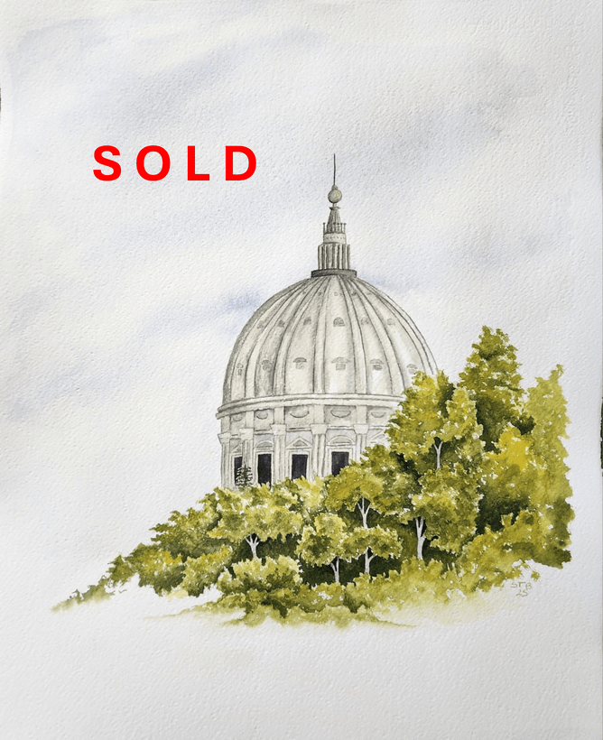 From the Out of Italy exhibition, Sandra Turner-Barlow continues to attract buyers for her renditions of religious structures. The exquisite watercolour composition entitled, St. Peter's Basilica, Vaticano II has sold to the appropriate religious order.