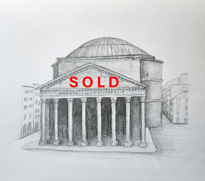 One of Sandra Turner Barlow’s most powerful graphite study in the Out of Italy exhibition is her rendition of the Pantheon, Roma. Cradled by alleyways or sampietrini, the structure of the building stands out, demanding visual dominion. Now sold.