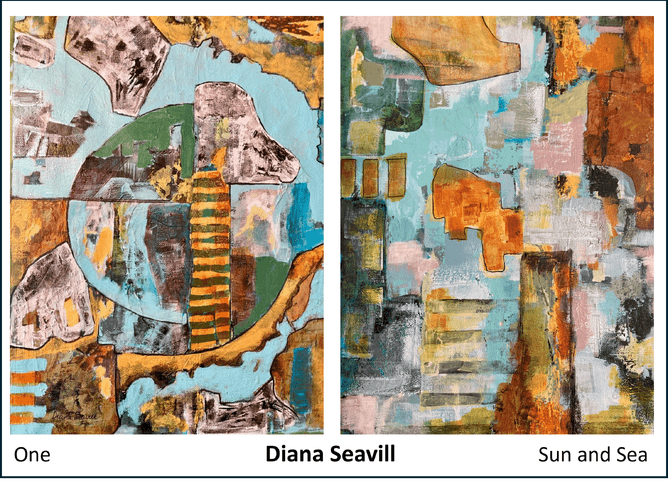 Diana Seavill's two delightful, complementary coloured abstract pieces from the Yours Abstractly exhibition, One and Sun and Sea, now sold to a UK collector from Leicester.