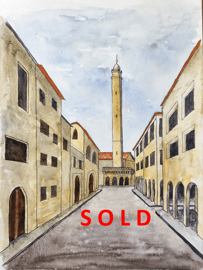 Sold from the Out of Italy exhibition is the watercolour composition by Sandra Turner-Barlow, entitled Via Rizzoli, Torre degli Asinelli, Firenze. In this painting, Turner-Barlow provides a moderne perspective that also embodies elements of her engaging expressionist technique.