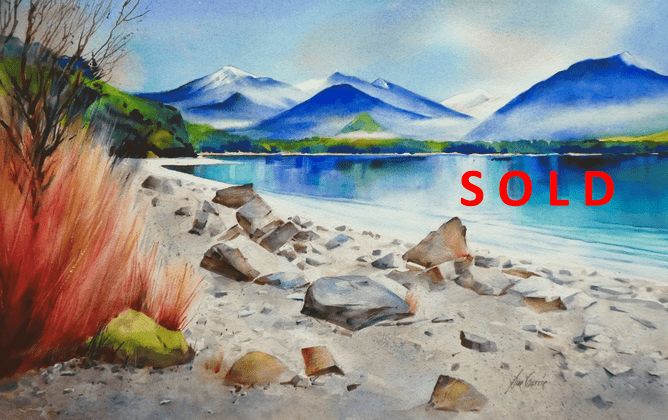 Serenity - Lake Manapouri, from South Island watercolourist and gallery artist, Sue Currie, now sold from the Winter Collection 2023. Sue's post impressionist work has delighted gallery visitors in all the exhibition where she has exhibited.