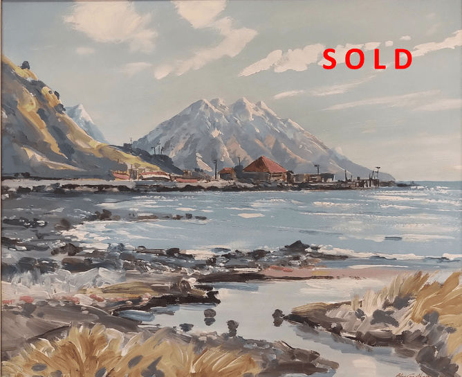 Sold on preview day of the 2025 Winter Collection exhibition; Aston Greathead's wonderful oil composition The Old Wharf from Armers Beach, Kaikoura.
