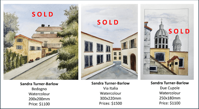 From the Out of Italy exhibition, gallery artist, Sandra Turner-Barlow has sold three more Italian scenes; Due Cupole, Via Italia and Bedogno. These beautiful watercolour compositions are taken from the areas around Bologna and Firenze.