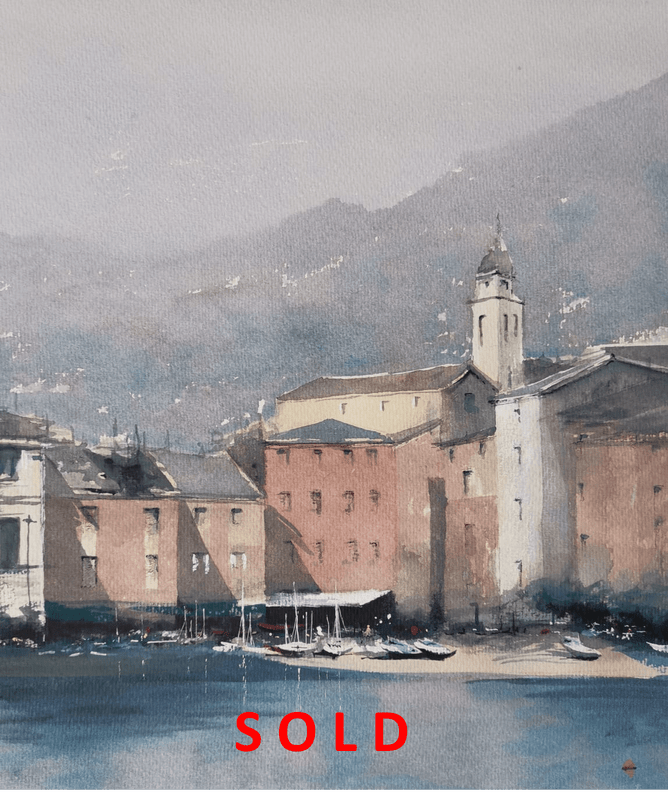 Portofino nestles into a small alcove near the Italian port of Genoa. Typical of the Italian Riviera, high elevations surround the mediterranean ‘vernacular’ style dwellings that include what is known as trompe-l'oeil, small ornamental arrangements that distinguish one structure from another. This painting is more subdued in colour and atmosphere than its subject. It is set in a more relaxed time of day with quiet activity on the shoreline as people relax and unwind. The soft hills suggest a hint of rain that belies the glitz and glamour of a world-famous location known for celebrity sightings and fast times.