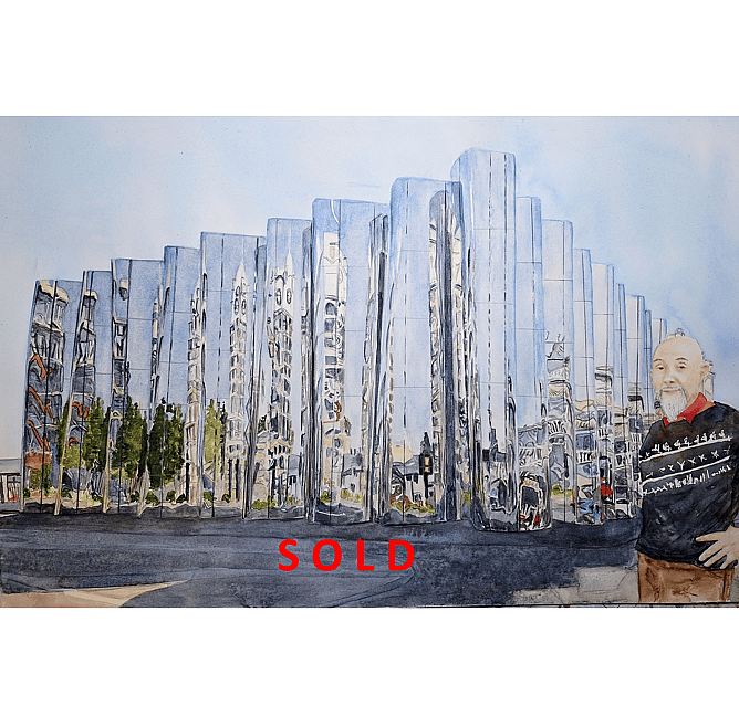 In this watercolour, the reflective surfaces of the Len Lye Gallery shimmer behind the figure of Len Lye himself, a meeting of maker and monument. Lye’s work, with its celebration of movement, light, and sound, extends beyond sculpture into the very architecture that houses it. The building, with its fluid steel façade, is both a canvas and a continuation of his vision, a conversation between art, artist, and space.