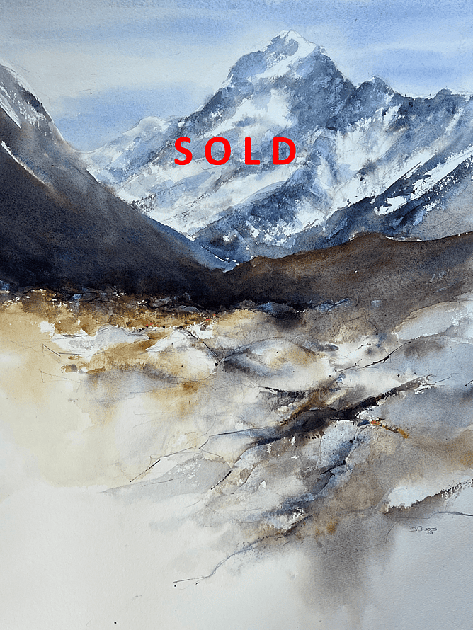 Bought by local collectors, from gallery artist, Bernadette Parsons is her stunning watercolour of Aoraki, Mount Cook. A show-stopper from the PEAKS exhibition.