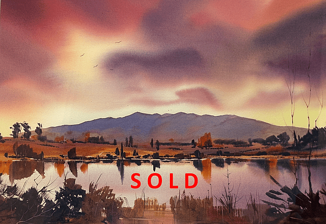 Sold from the Waikato Watercolourists II exhibition, is a dramatic post-impressionist composition by gallery artists Martin Necas, entitled, Hot Summer Evening, Lake Ngaroto. This painting matches the buyer’s memories of this place and time. Art alignment; meant to be.