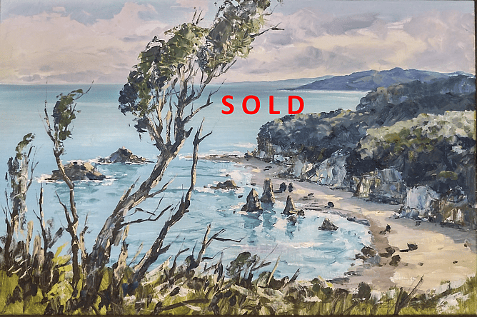 This is a magnificent painting entitled Motukiekie Rocks by Aston Greathead that presents a view of the Motukiekie Rocks on the West Coast of the South Island, looking north towards the pancake rocks at Punakaiki Beach. Snapped up by a recently returned expat from the U.S.