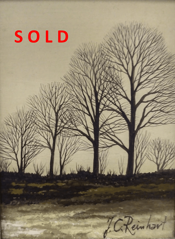 From the Fine Art Society New Zealand, the gallery presents and sells the estate of European fine artists. In this case the oil on board composition Winter Trees I by German artist, J.C. Reinhart