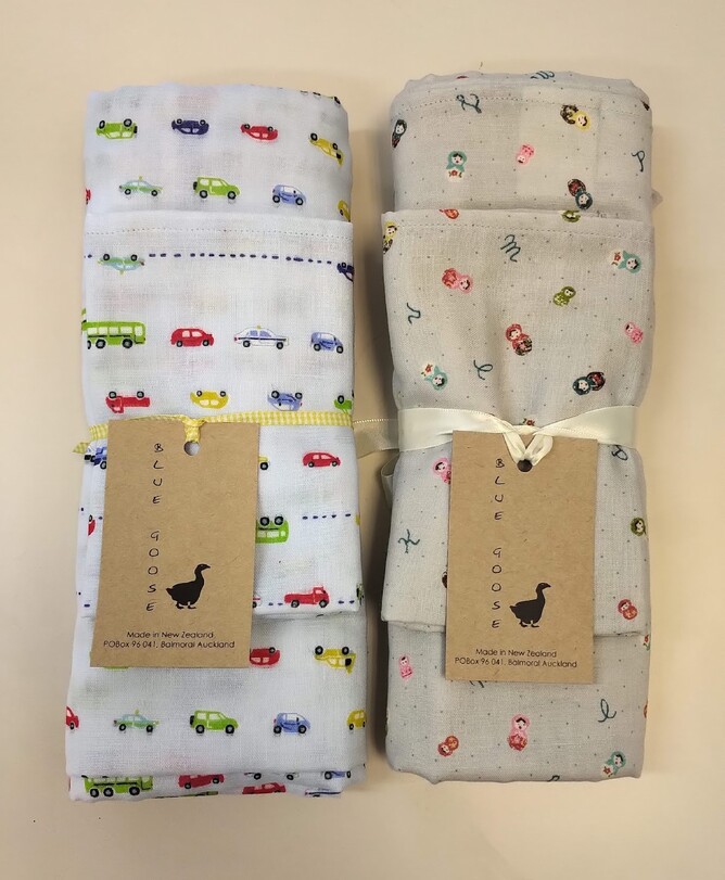 printed muslin 108cm wraps and wash cloth with Russian doll motif // Blue vehicle motif