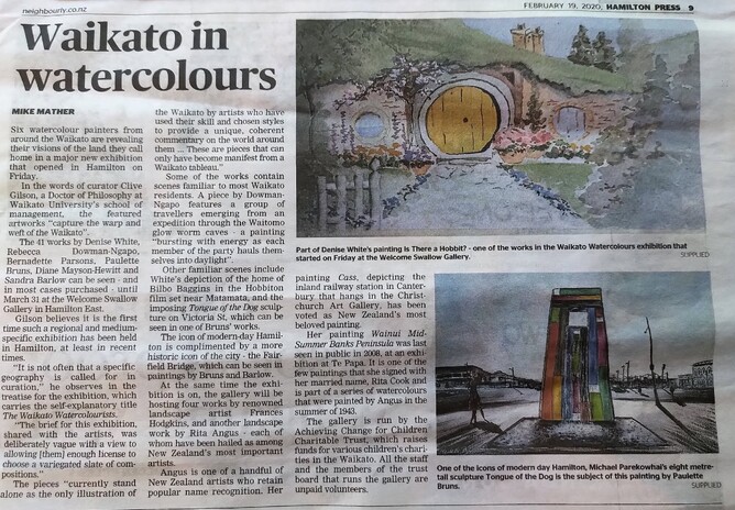 The recently launched Waikato Watercolourist Exhibition @ The Welcome Swallow Gallery has attracted wide publicity. A half page article that features the exhibition with additional references to the Hodgkins exhibit and Rita Angus watercolour, has been published in stuff.co.nz, The Waikato Times and the Hamilton Press (see below). In the week following the 14th February launch, an estimated readership of over 100,000 has been reached. This has seen the Gallery hosting many new visitors who have enjoyed the exhibition. The exhibition runs to the end of March. Don't miss it!