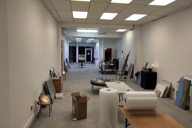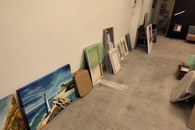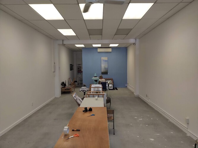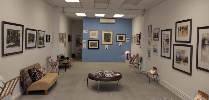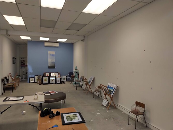 However, there are times when we are preparing for a new exhibition when we are not exactly looking our best! Frequently the changeover can involve over twenty or more artists with their work being removed and replaced. This intense activity takes place on a Wednesday before going live at the Friday launch. Starting mid afternoon the existing exhibition is taken-down, wrapped and marked for distribution to purchasers. The new exhibition then begins to take shape. Curation involves not only the thematic focus of the exhibition but size of the paintings, the nature of the composition, colour, texture, style, medium, framing and available wall space. Wall maintenance is also a constant. Effectively each exhibition has its own path-dependent algorithm. The new exhibition is usually completed by 10pm on the same day and properly 'dressed' the following morning.