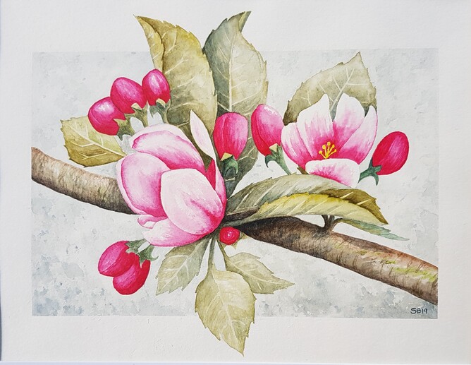 First seen in the christmas in the gallery exhibition last year, Sandra Barlow presents an intense study entitled, Apple Blossom. While the white tinged luxurious red blossoms in full bloom are clearly the central feature of the composition, they are augmented with several buds that are yet to fulfill their promise. Adding to the visual impact, the leaves are allowed to intrude and spill over the faux matt board that forms the parameters of the painting. This is a splendid splash of nature that cannot be contained. More is to come; life affirming.