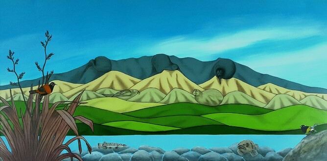 This painting, Aotearoa Sanctuary Mountain, was created to celebrate the re-introduction of certain native species to the sanctuary – it features the Kiwi, Tieke (Saddleback), North Island Kaka, Takahe, Banded Kokopu, Giant Kokopu and Hihi (Stitchbird).